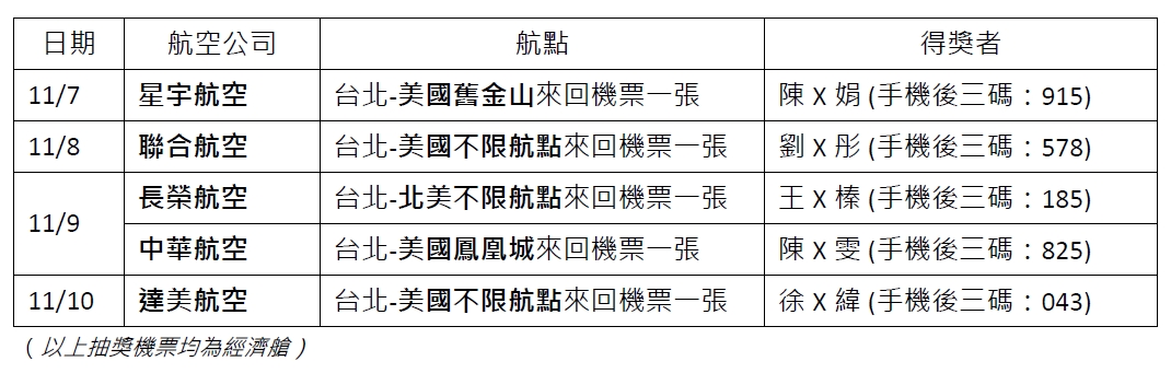 美國館的集章抽機票活動共送出5張機票大獎,得獎名單如下: